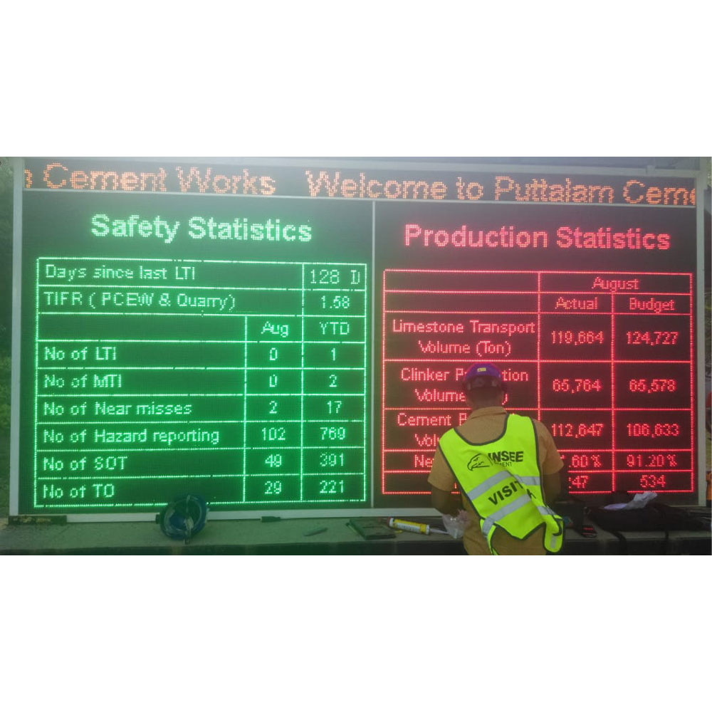 Indoor Displays Commonly uses SMD displays with higher pixel pitch (resolution). Suitable to display data within factory premises and in environments where direct sunlight does not fall on the display.